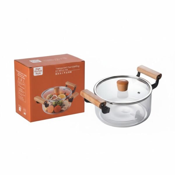 The design features high transparency, allowing you to monitor the cooking process without lifting the lid, preserving flavors and moisture. The side handles of the pot and the knob on the lid are made of natural wood, providing a comfortable and secure grip while adding a warm aesthetic touch. This pot is easy to clean, healthy, and does not absorb odors or stains, making it a distinctive decor piece in your kitchen or on your dining table.