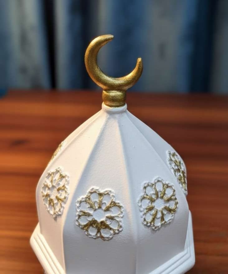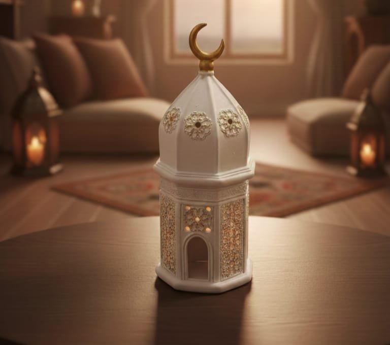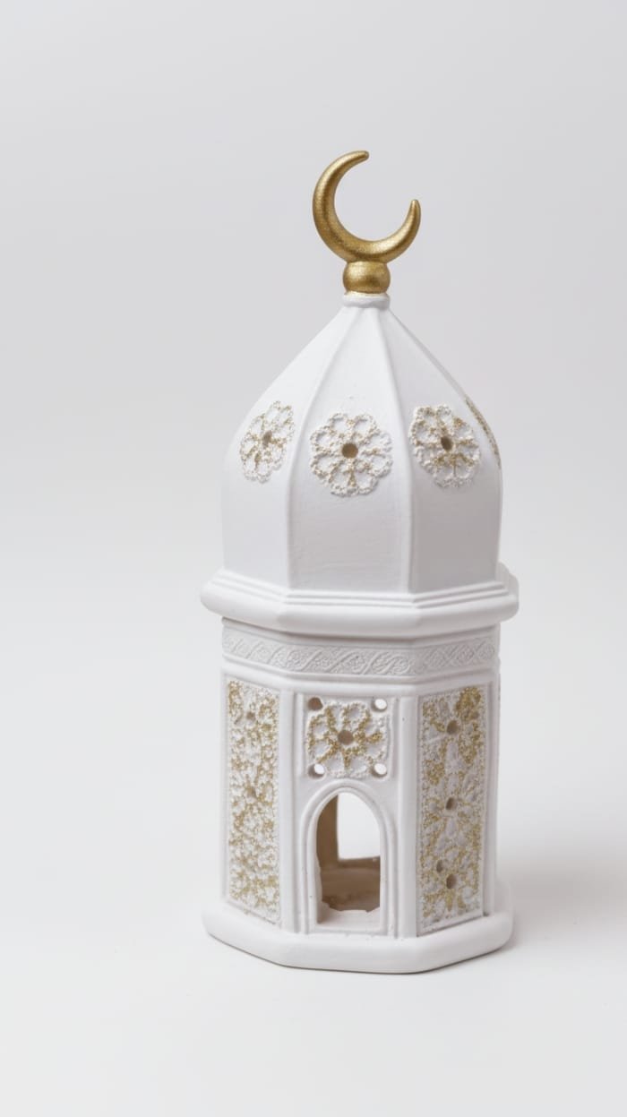 Transform your home into a warm and festive retreat with this classic Ramadan lantern, blending traditional design with a modern, elegant touch. Crafted from durable, high-quality porcelain in a clean white finish, the lantern features a multi-faceted dome top capped with a beautiful gold crescent. Intricate gold patterns and detailing adorn its sides, creating enchanting light patterns when illuminated. Perfect as a centerpiece for your Iftar table or as ambient lighting throughout your home, this lantern is a timeless addition that will bring warmth and a welcoming atmosphere to your holy month celebrations for many years to come.