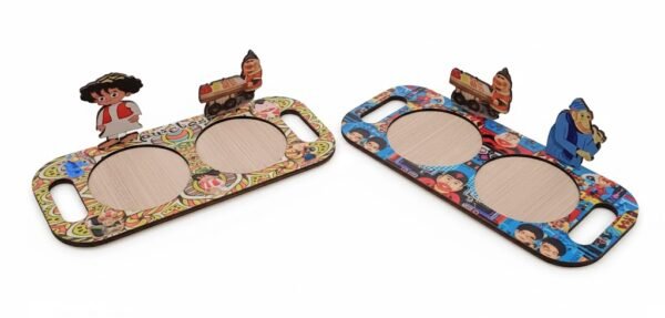 This product is a practical and innovative wooden serving coaster, designed with a “2-eye” pattern (two circular openings) to securely hold two cups or small bowls. The coaster is made from durable compressed wood (MDF) or a similar material, and features a decorated surface with vibrant cartoon graphics of popular Ramadan characters like “Fananees”, adding a touch of joy and celebration to the dining table or any other surface. It is ideal for serving juices, drinks, along with dates, nuts, or light snacks during Iftar and Suhoor gatherings or family sessions. Its flat and lightweight design makes it easy to use and clean, combining aesthetic appeal with functionality as a distinctive Ramadan decor piece.