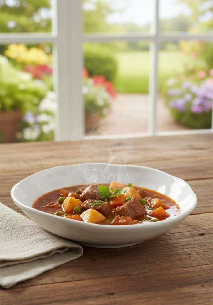 - 21 cm deep thermal porcelain plate with an elegant white “organic” design and curved edges. Perfect for serving hot soups and stews directly from the oven to the table.