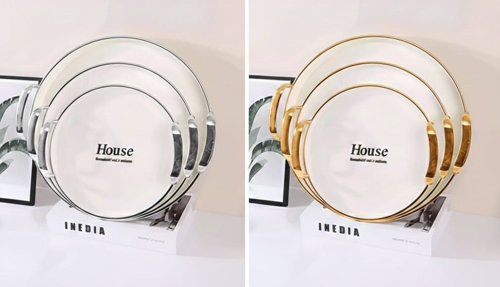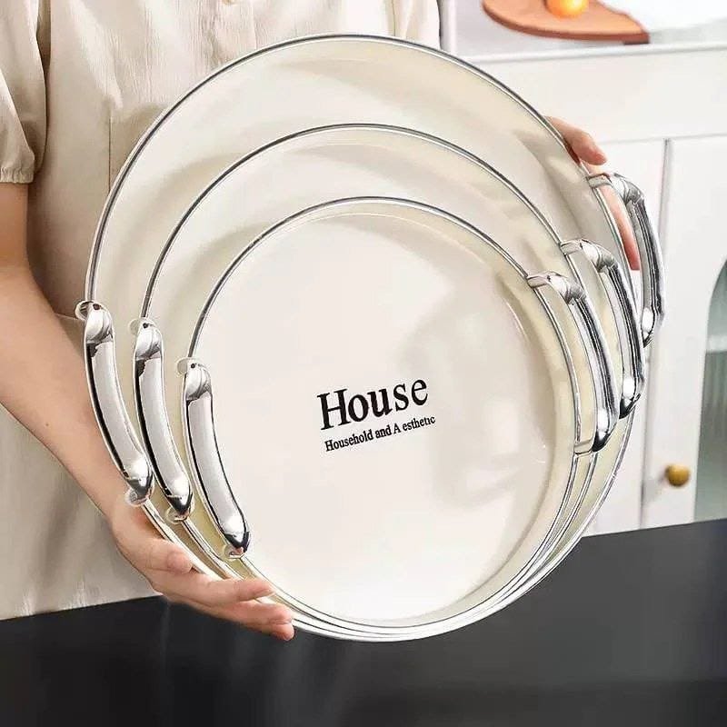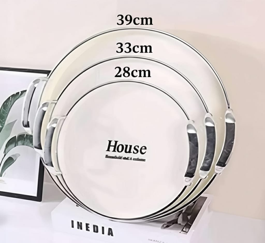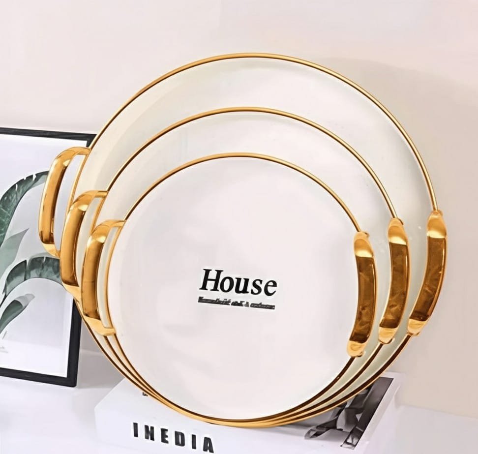 Elevate your servings with the stylish House 3-piece serving tray set. These trays feature a modern round design and luxurious silver and gold handles, made from durable, shatter-resistant acrylic material. Perfect for serving drinks, desserts, or as an elegant decorative piece in your home.