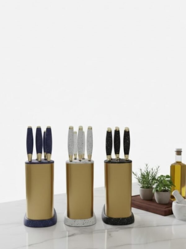 Professional Precision & Aesthetic Touch in your kitchen. This elegant knife set consists of 5 knives in different sizes. It features sharp, rust-resistant stainless steel blades and comfortable handles with a luxurious marble design (available in multiple colors like blue, white, and black). It comes with a modern gold stand that keeps them organized and adorns your kitchen countertop.