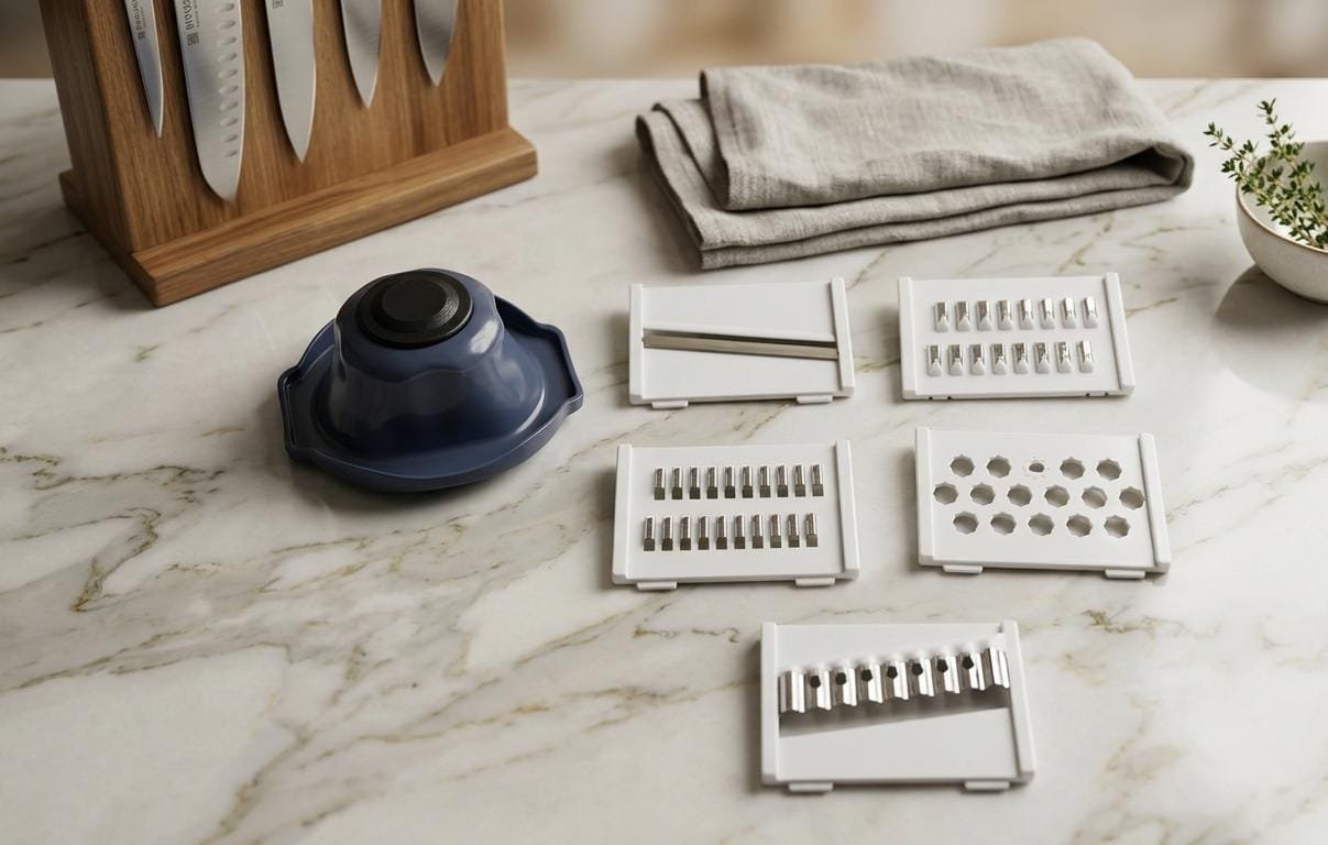 - Versatile Blades: Includes 5 interchangeable stainless steel blades for slicing, fine grating, and coarse shredding.