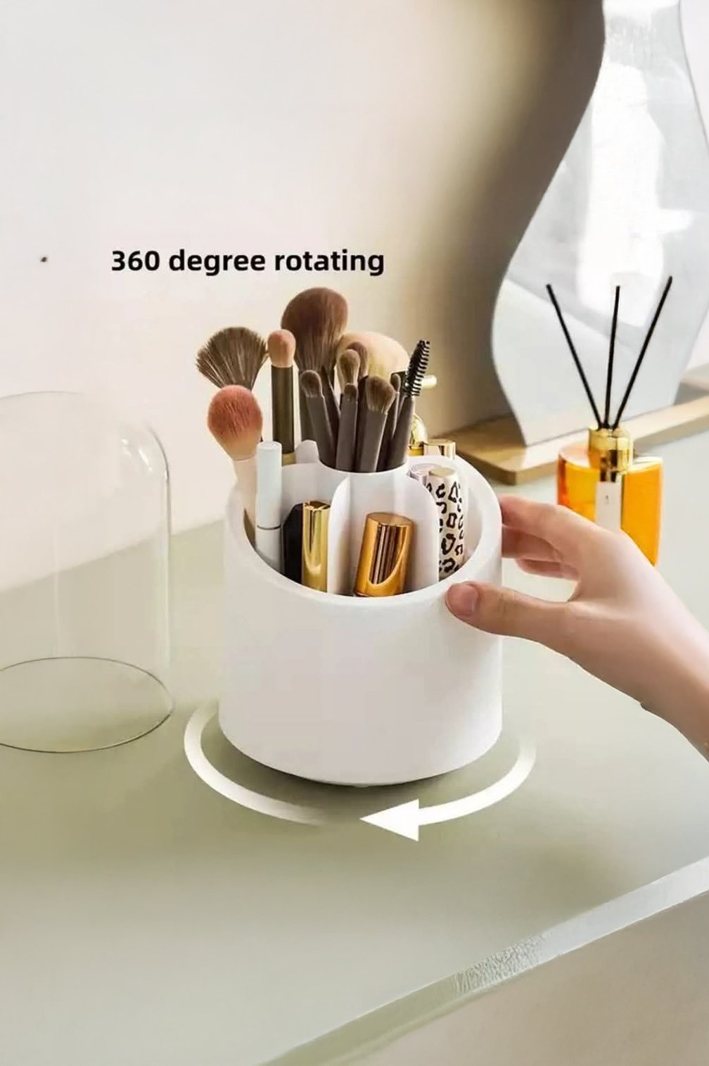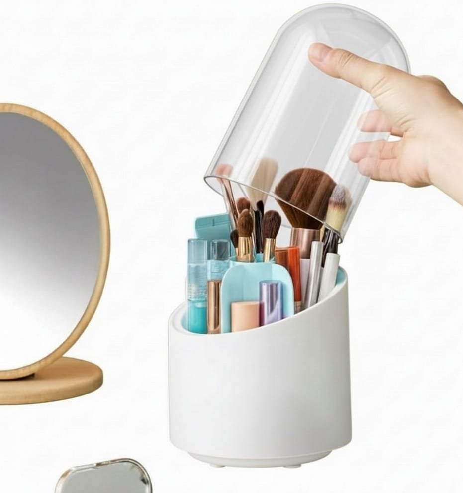 360° Rotating Makeup Brush Holder with Lid – The perfect solution for keeping your cosmetic tools organized and dust-free. A modern design featuring a clear, protective cover for hygienic storage of your daily brushes and lipsticks.