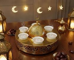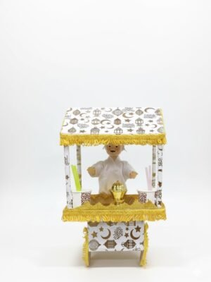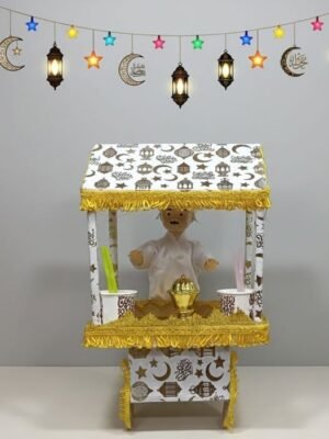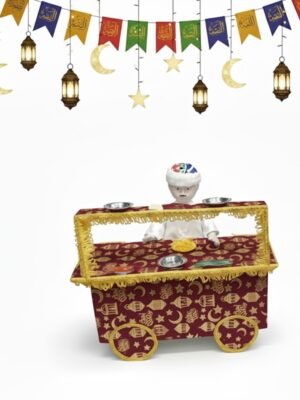 Elevate your hosting experience with this luxurious metal serving set, designed to add a touch of sophistication and authenticity to your occasions and family gatherings. The set consists of a shiny gold-colored round metal serving tray, decorated with intricate traditional Arabic patterns that allow light to pass through, creating beautiful shadows (as in the image). The set includes a stylish date bowl with a lid, adorned with a decorative metal crescent on top, and six (6) small coffee cups made of high-quality white porcelain. This set is perfect for serving dates and traditional Arabic coffee, and is a wonderful addition to your home decor or an ideal gift for those with refined taste.