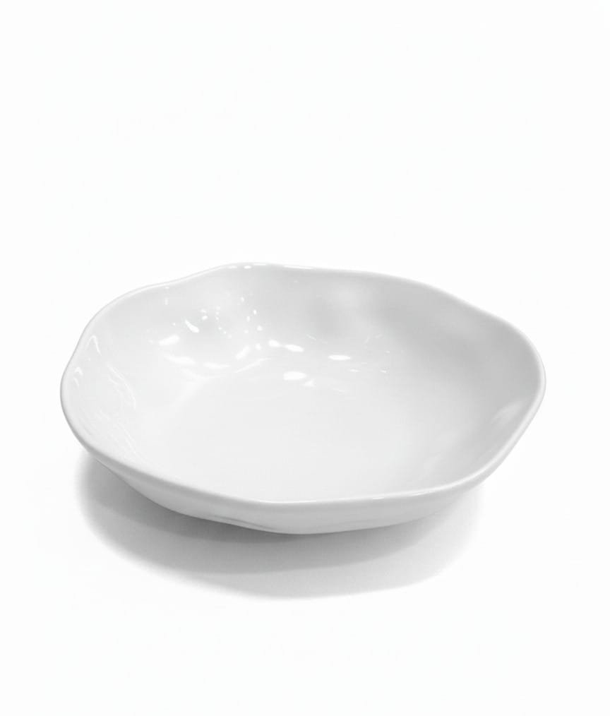An elegant deep porcelain plate by Fathy Mahmoud, featuring an organic white (irregular) design that blends art and functionality. Perfect for serving pasta, soups, and salads. It is safe for use in the dishwasher, microwave, and oven.