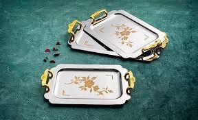 A luxurious 3-piece stainless steel tray set, featuring three trays in varying sizes designed to exude elegance and sophistication.