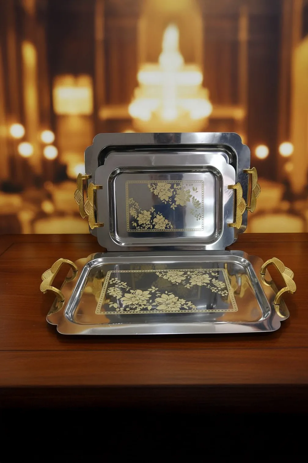 Elegant 3-piece stainless steel tray set with golden floral designs and practical handles, ideal for serving and decoration.