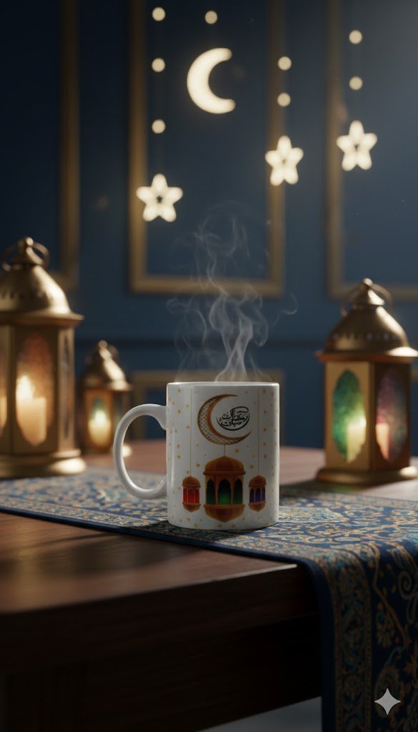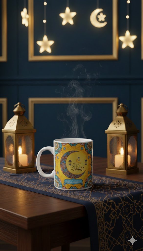 Enjoy your coffee or favorite drink in the holy month with this elegant Ramadan porcelain mug. It features high-quality digital printing of crescent and lantern motifs and “Ramadan Mubarak Alaikum” Arabic calligraphy. Perfect for Iftar and Suhoor meals or as a thoughtful gift for loved ones.