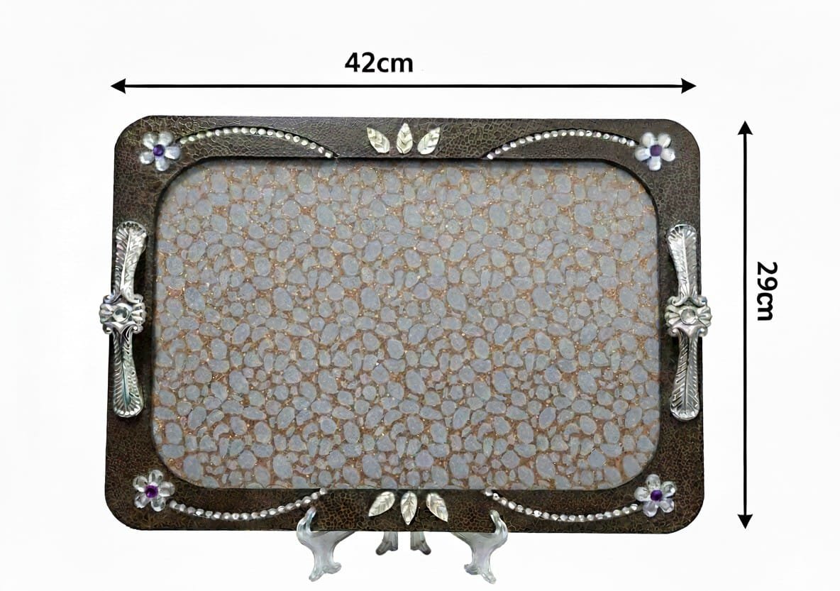 Elevate your serving experience with this luxurious two-piece serving tray set. Crafted from durable wood, each tray features a rectangular-oval shape with rich brown edges embellished with small crystal beads and elegant mauve crystal flower accents. The silver metal side handles feature a traditional Western-inspired design (concho and feather), adding a touch of rustic sophistication. The tray interiors are fitted with clear glass protecting a light blue and shimmering bronze textured pattern, making them ideal for securely holding glasses or dishes. This set is perfect for everyday use or special occasions, adding a refined touch to your home decor.