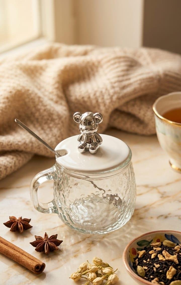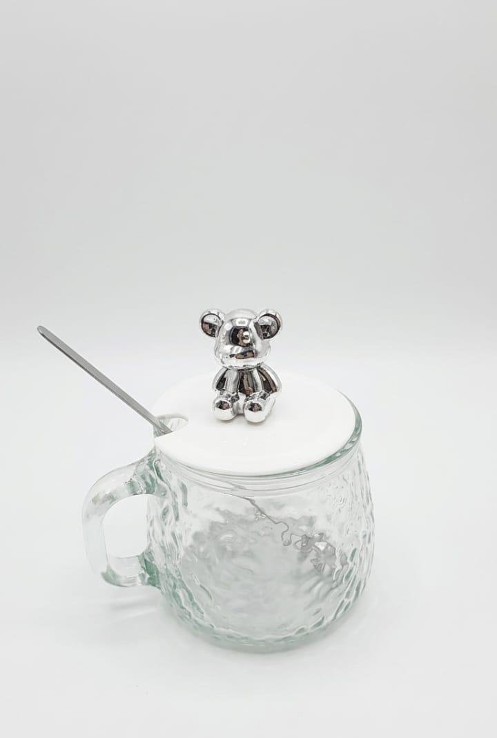 - Elegant Textured Glass Mug featuring a stylish lid with a shiny silver “Teddy Bear” knob and a matching stainless steel spoon. A perfect blend of charm and sophistication for your daily brew or a thoughtful gift.