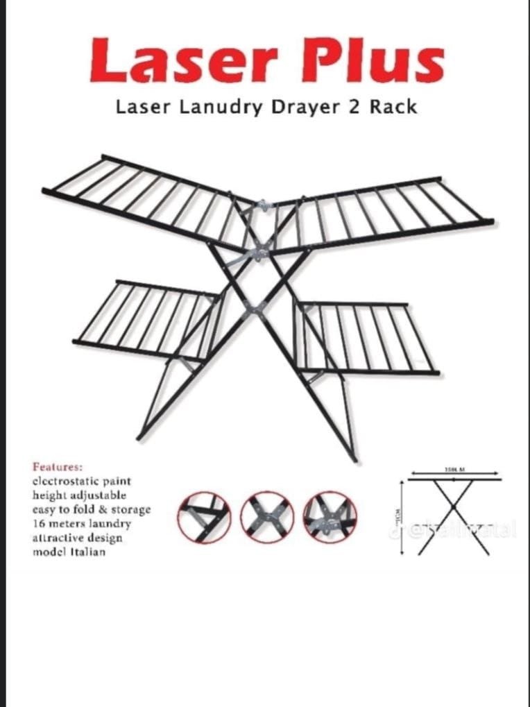 Dry your clothes efficiently with the “Laser Plus 2 Tier Laundry Dryer”. This rack features an Italian design that is foldable and adjustable, offering a large drying space of up to 16 meters. It is made of strong metal with an electrostatic paint finish to resist rust and ensure durability. Perfect for both indoor and outdoor use.