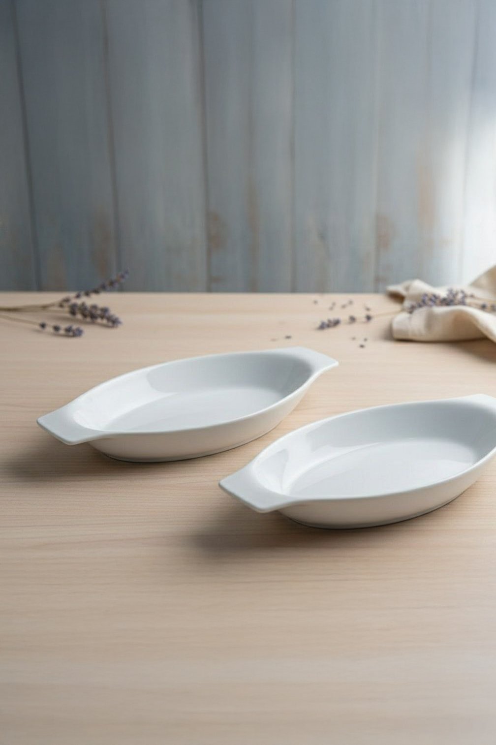 Elegant and versatile white porcelain oval lasagna dish, perfect for baking and serving straight from the oven to the table. It features convenient handles for easy transport and is safe for use in the oven, microwave. It length is 32cm and its internal width is 16cm