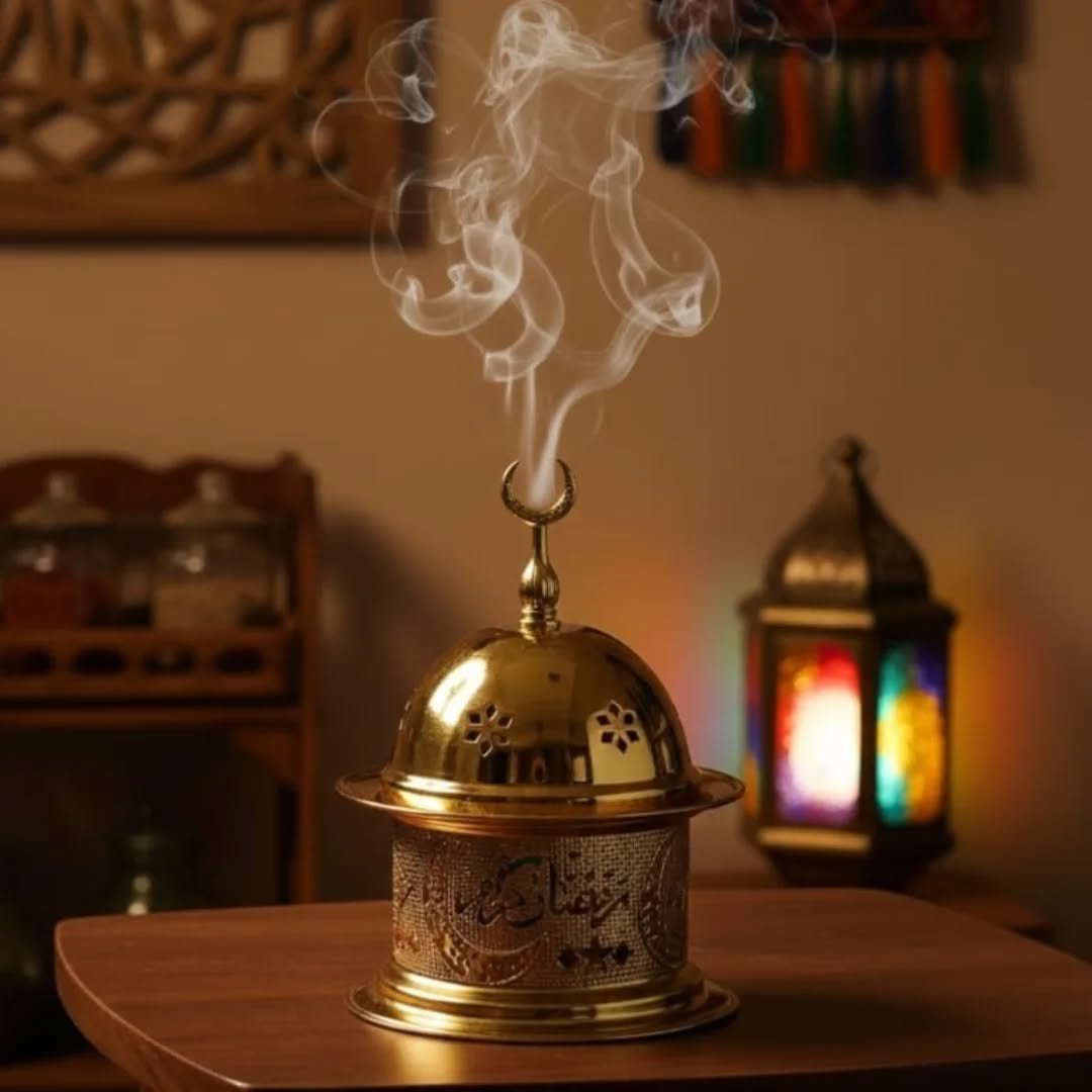 Metal Ramadan lantern incense burner, luxurious and equipped with warm LED lighting. Perfect for perfuming the Ramadan atmosphere and adding a touch of elegance and stylish oriental decor.