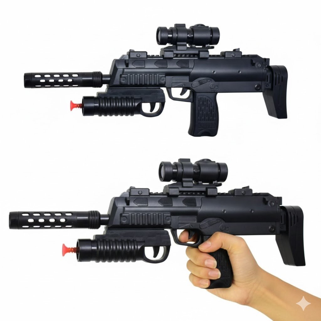 A vibrating toy gun with music and light effects, designed to give kids an exciting and fun-filled play experience.
