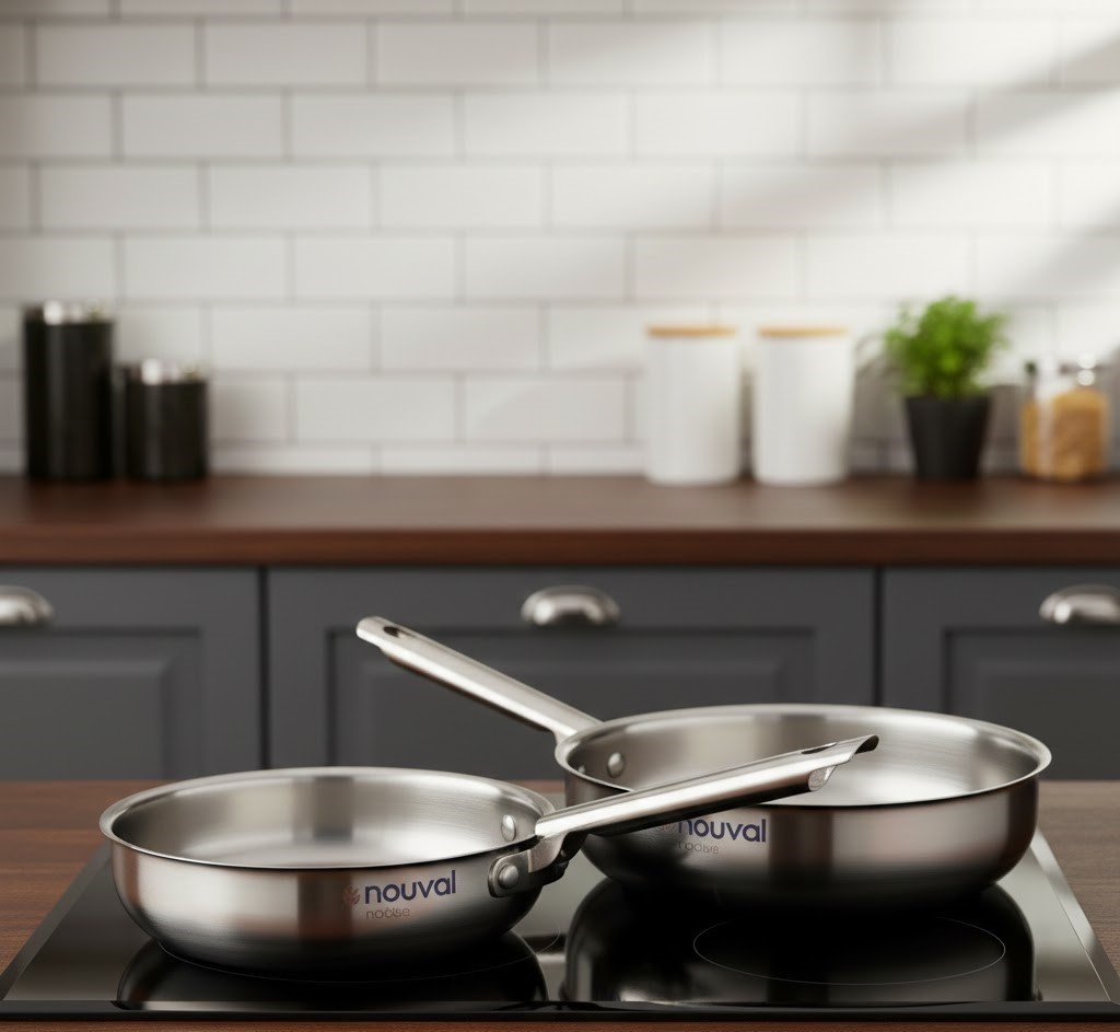 Elevate your kitchenware with this two-piece Nouval stainless steel frying pan set (sizes 18 and 24 cm). This set offers high quality and perfect heat distribution, ideal for daily frying and cooking healthy meals. The stainless steel handles provide a comfortable and secure grip.