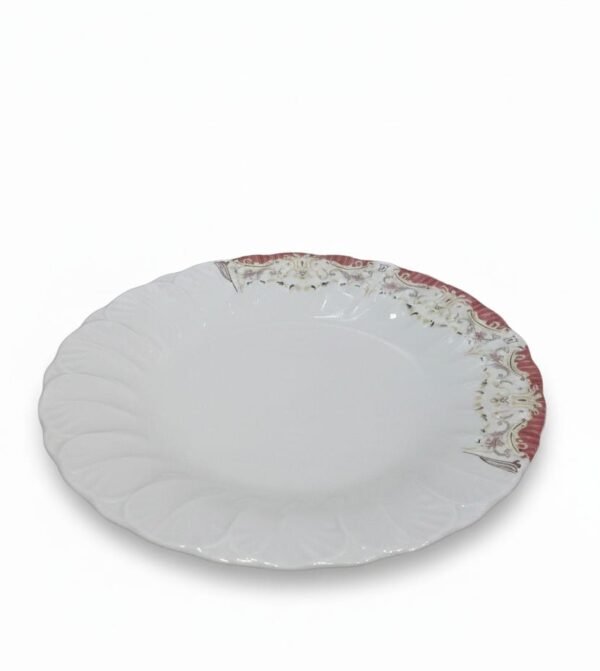 Add a touch of sophistication to your dining table with this premium porcelain flat plate, measuring 27cm in diameter. The design balances simplicity and beauty, as the crisp white surface features an ornate rim with warm red and gold accents that lend a regal feel. This plate is not just a decorative item; it is designed to be highly practical, being scratch-resistant and resilient to daily bumps and use.