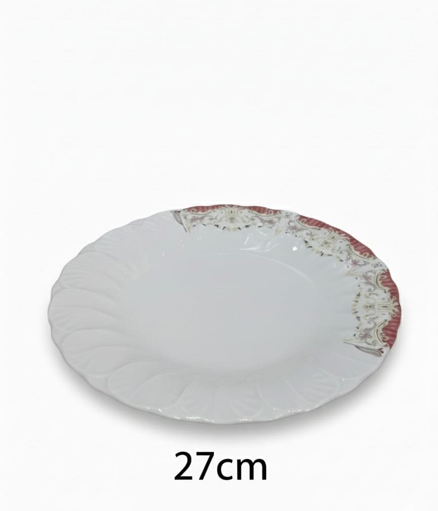 Elegant 27cm round flat porcelain plate with a classic design, featuring an ornate red and gold rim. Ideal for serving main courses, it is durable and safe for daily use in the dishwasher and microwave.