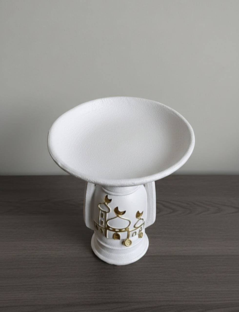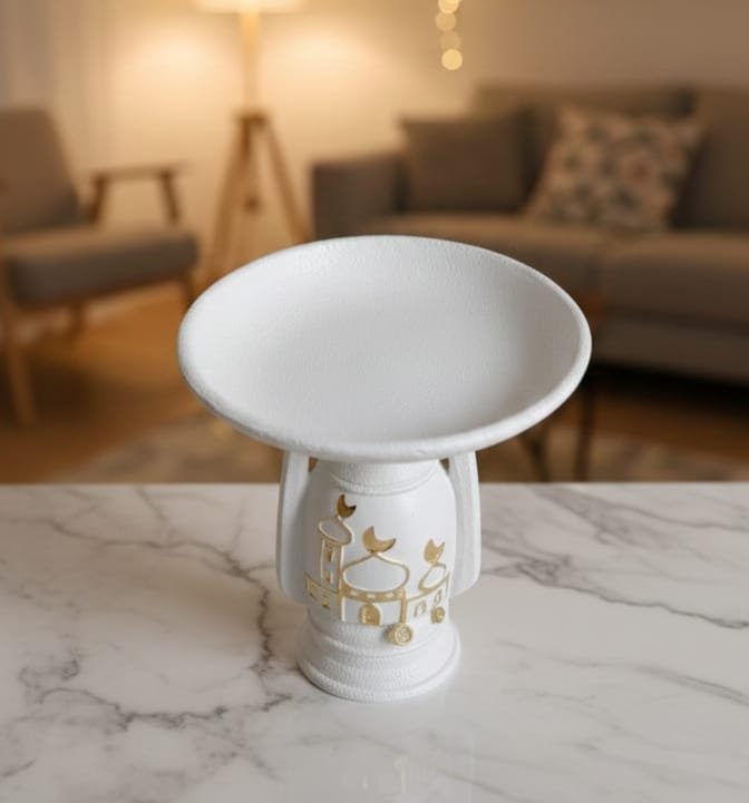 - The design features a sturdy base shaped like a white lantern adorned with elegant Islamic patterns and gold accents, topped with a wide circular tray.