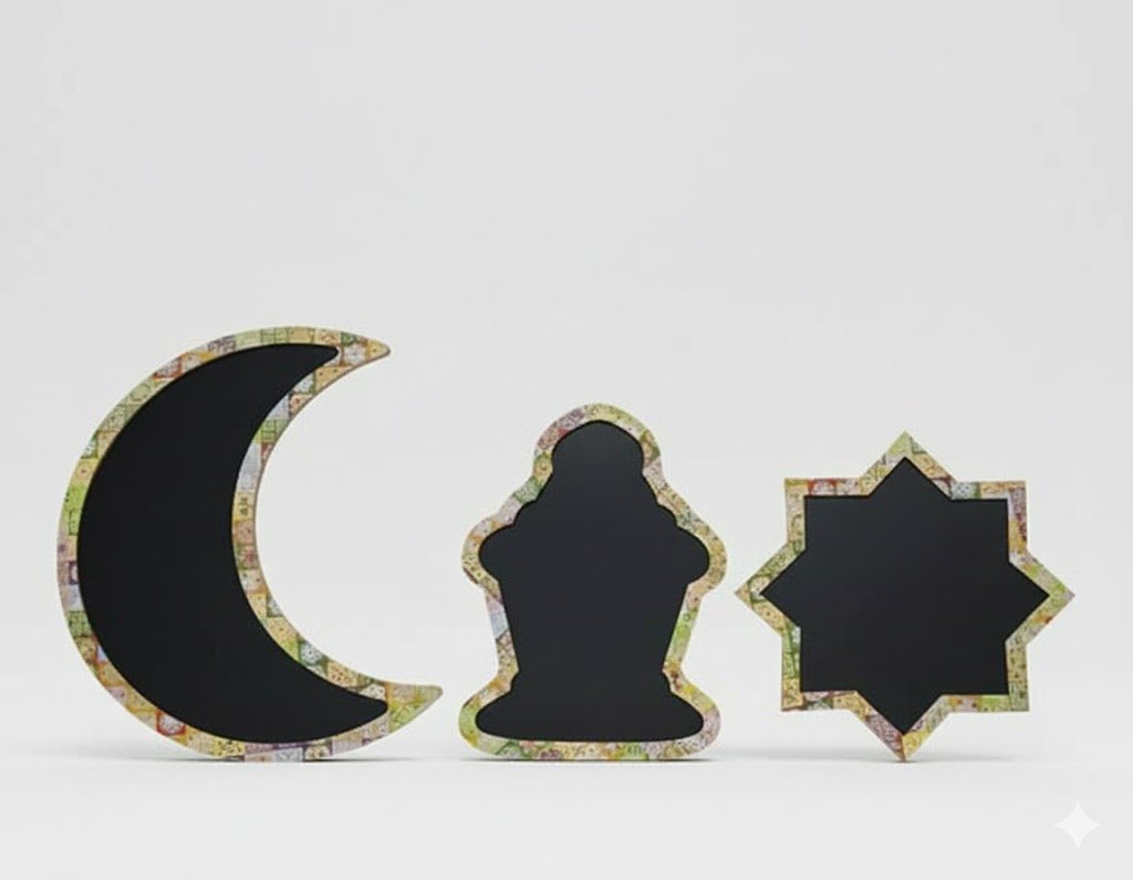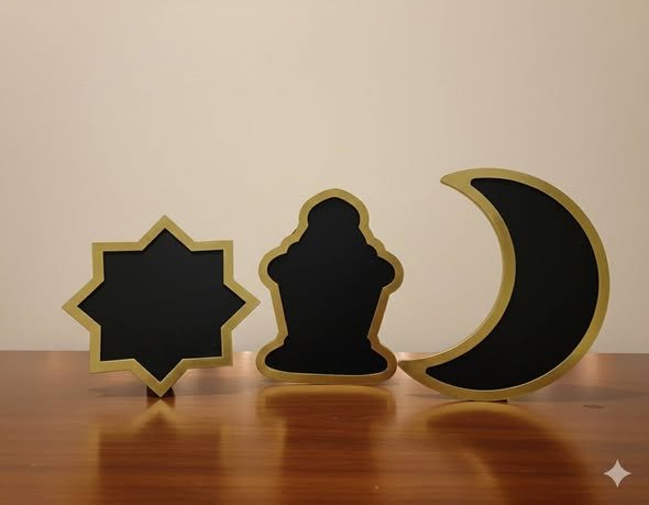 This set is a unique and versatile addition to your home decor during the holy month of Ramadan. It consists of three decorative pieces made of a lightweight material (like wood or metal) covered with a matte black paint in the center, allowing you to write welcome messages or food names using chalk. The edges are decorated with colorful paper or plastic patterns featuring traditional Islamic motifs. They can be used as serving dishes for snacks and nuts, or as wall/table decorations to display festive phrases. This set combines practicality and aesthetic appeal to create a distinctive and welcoming atmosphere in your home.
