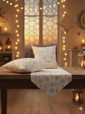 This cart is a distinctive decorative piece made from a lightweight material (like wood or plastic) and carefully designed to mimic traditional Egyptian street carts during Ramadan. It comes in a basic white color adorned with shiny gold patterns including crescents, lanterns, and stars. It features a small figurine representing the vendor and a gold-colored holder, giving it an authentic and heritage feel. It can be used as a main element in a “Ramadan corner” at home, or to place small amounts of dates or sweets on it. This product combines practicality and aesthetic appeal to create a distinctive and welcoming atmosphere for family and guests.