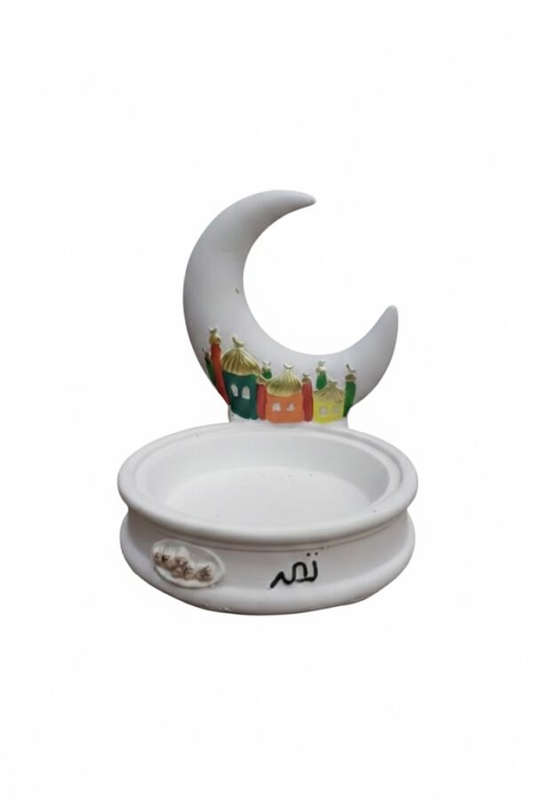 This item is a handcrafted decorative serving dish made from high-quality white glossy porcelain. It features a unique design combining a circular base plate and a crescent moon arch backdrop. The crescent is embellished with detailed, glazed hand paintings of small, colorful buildings (gold, green, orange, yellow), reminiscent of Islamic cities. The deep base plate is ideal for serving luxurious dates or small sweets, making it an elegant and distinctive addition to your iftar and suhoor table. A versatile art piece that reflects high craftsmanship and creates a festive and warm ambiance in your home throughout the holy month of Ramadan.