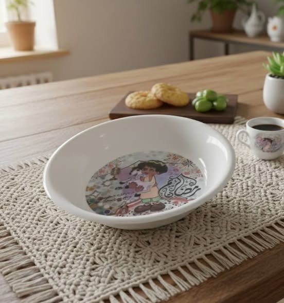 This product is a versatile serving plate, specifically designed to decorate the Ramadan table setting. The plate features a round shape and an attractive design with popular cartoon graphics associated with the holy month. The plate is made exclusively from high-quality melamine material, known for its durability and break-resistance, making it safe and practical for daily use and around children. It can be used for serving a variety of foods, main dishes, or side meals. The vibrant colors and cheerful patterns make it a wonderful addition to home decorations and enhance the warm, festive atmosphere during family gatherings and Ramadan nights.