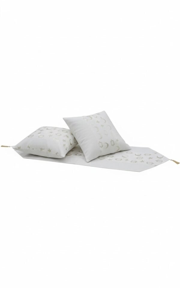 An elegant Ramadan decor set consisting of a table runner and two cushion covers in a light, calm color. It features a “half Islamic” design (crescent moon and stars) printed or embroidered in a subtle shade (silver or pale gold), giving it a modern and versatile feel.