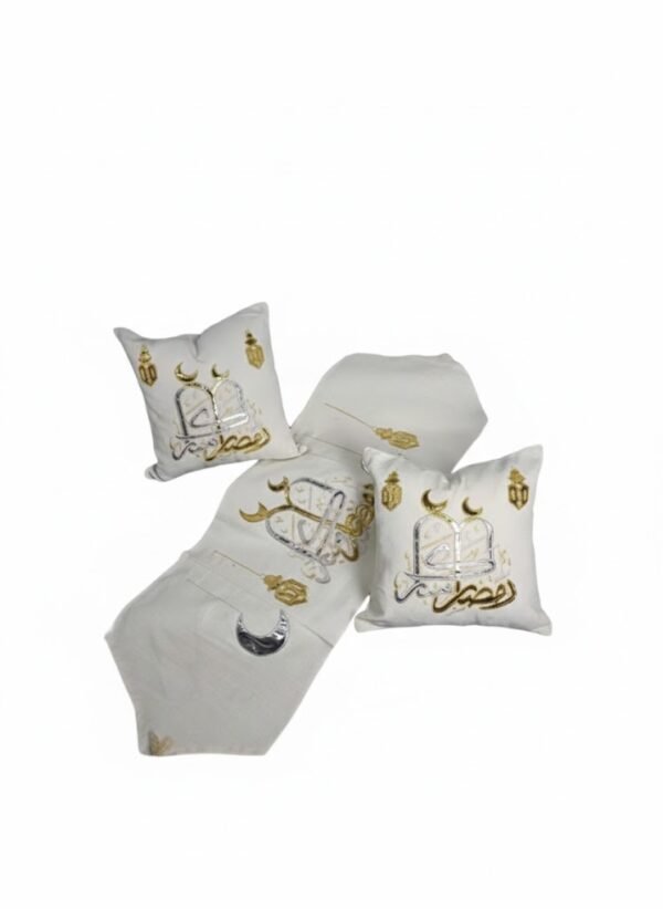 This set is a perfect addition to decorate your home with a touch of sophistication during the holy month of Ramadan. It includes a long table runner and two matching cushion covers, made from durable, high-quality duck fabric. The design features intricate Islamic patterns and elegant Arabic calligraphy (such as “Ramadan Kareem”), hand or machine embroidered with gold and silver metallic sirma threads, giving it an attractive sheen and expensive look. The set combines a traditional feel with high craftsmanship to create a festive, distinctive, and welcoming atmosphere for family and guests.
