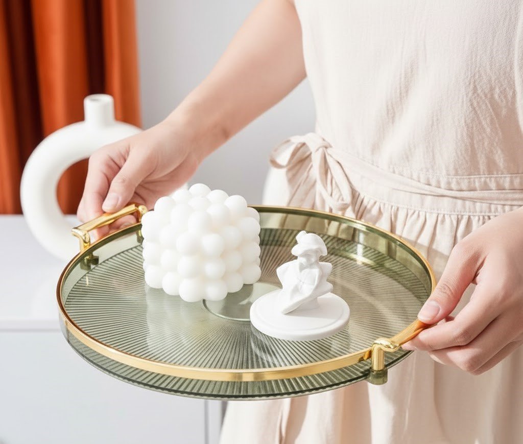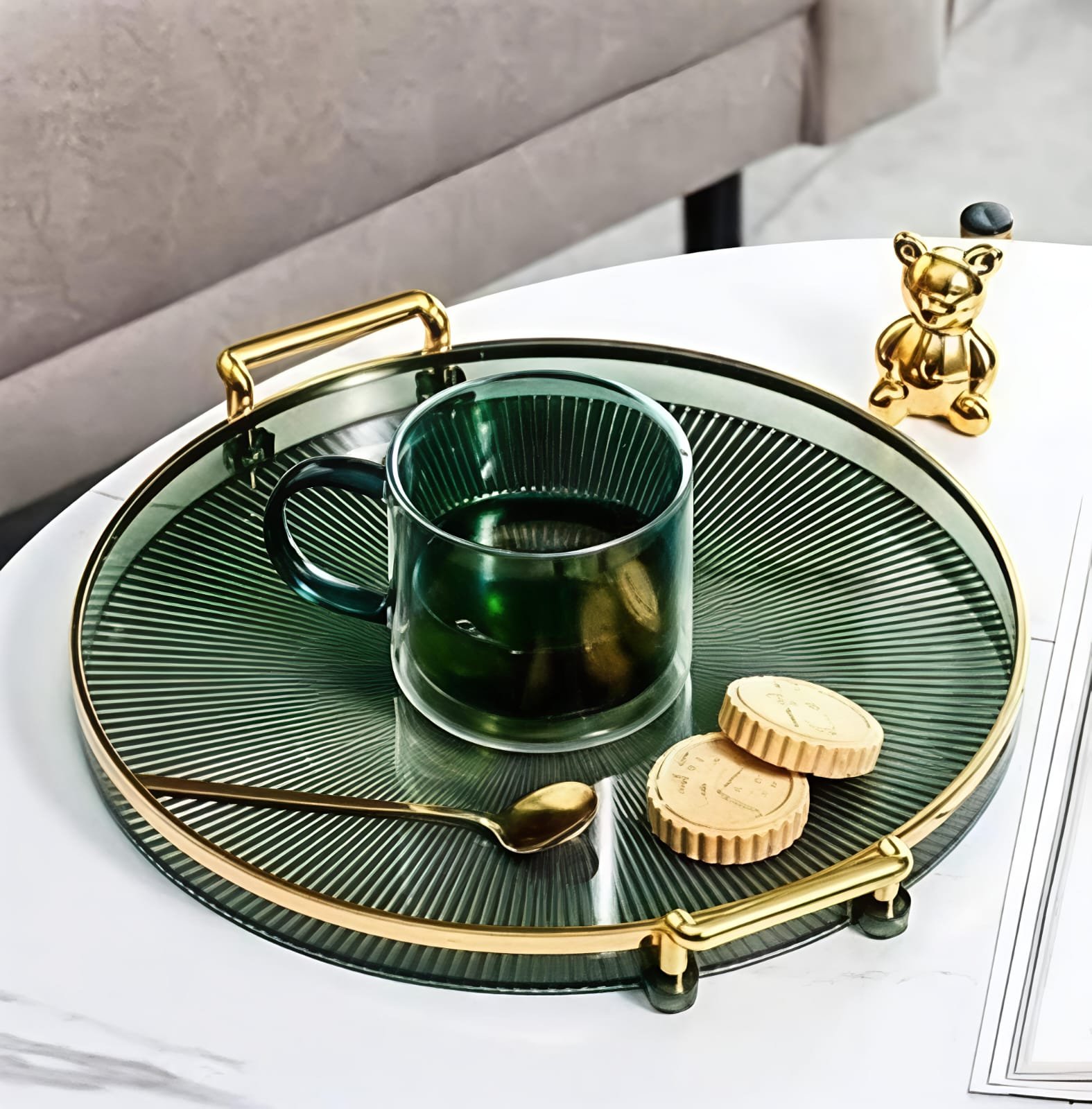 Discover luxury and sophistication with this round serving tray crafted from high-quality, durable acrylic. It features a calming green color and a sleek gold frame with bright golden handles for a modern, eye-catching look. The fine radial pattern on the surface creates an attractive visual effect, adding an artistic touch to your home decor. This tray is not just a serving tool, but a stylish decorative piece that can be used in a variety of scenarios: serving breakfast in bed, drinks for guests, or as an elegant organizer on your coffee table, bathroom vanity, or living room for displaying candles and accessories. The strong golden handles make it easy and safe to transport, and its smooth surface ensures excellent stability for cups and pots. The thickened, break-resistant design ensures long-lasting durability, and it can be easily cleaned with a damp cloth.