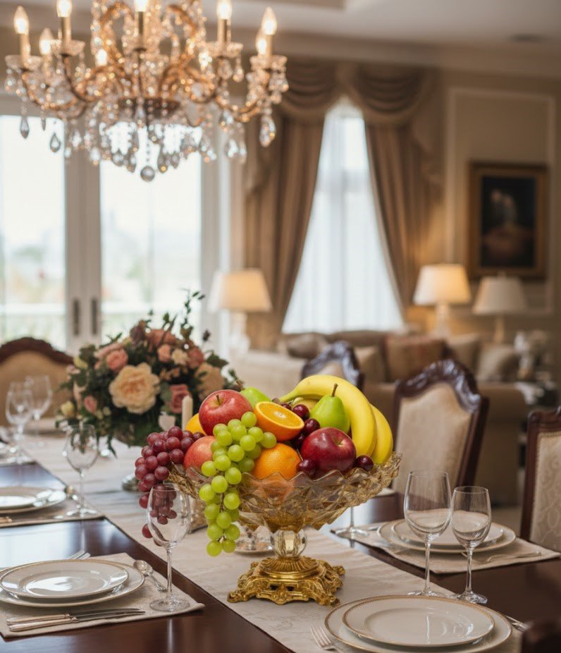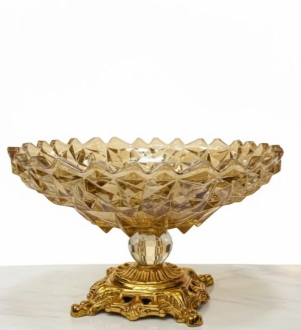 Timeless Elegance: A luxurious glass fruit bowl with a sturdy, ornate brass base. Classic design adds a sophisticated touch to your home decor. Perfect for serving fruits or as an elegant centerpiece on your dining table.