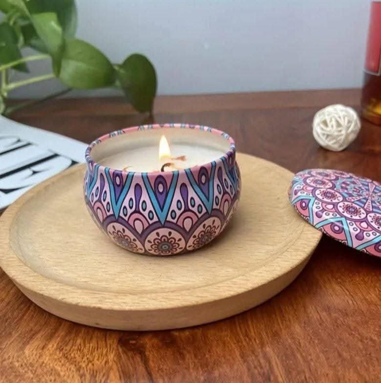 A single scented candle made from natural soy wax, housed in a decorative mandala-patterned tin jar.