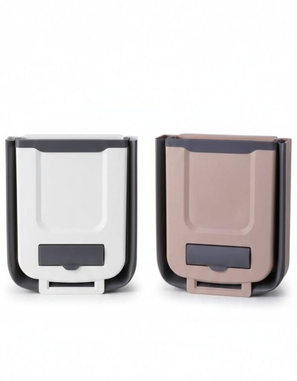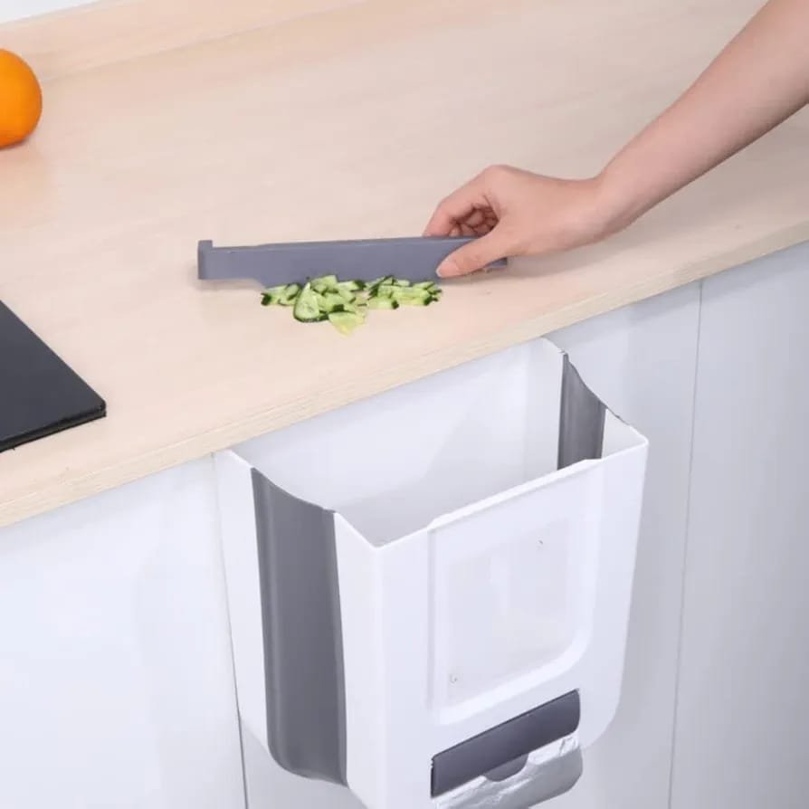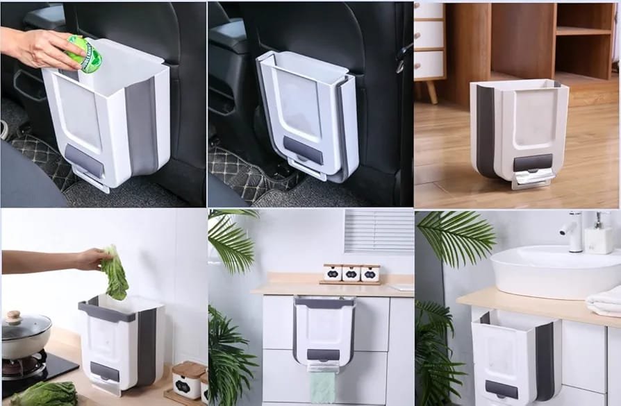 A foldable silicone trash can that saves space and can be hung on a cabinet door or placed on the floor. It features a versatile design and is made of durable, waterproof materials for easy cleaning
