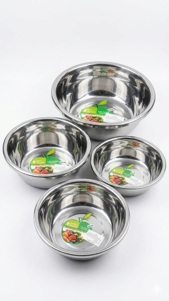 - 4-Piece Stainless Steel Mixing Bowl Set (24, 26, 28, 30 cm). Multi-purpose design for kneading, washing vegetables, and serving fruits. Durable, rust-resistant, and easy to clean.