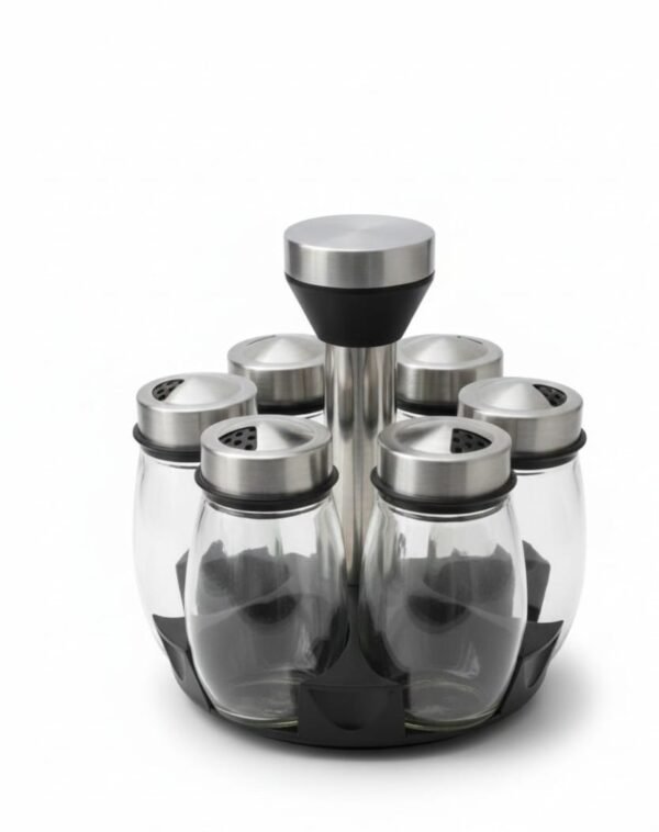 Organize your kitchen with style and functionality with this 7-piece rotating spice rack set. The set includes 6 clear glass spice jars, allowing you to easily see the contents . Each bottle is topped with a rust-resistant stainless steel lid* Plastic, designed with multiple dispensing holes to suit various spices and herbs . The jars are securely held in a solid central stand featuring a 360-degree rotating base, ensuring quick and effortless access to any spice you need while cooking. The compact and modern design saves valuable counter space and keeps your kitchen tidy and organized . This set is the perfect addition to any contemporary kitchen or a great gift for cooking enthusiasts