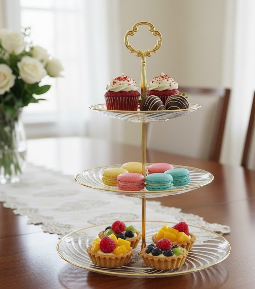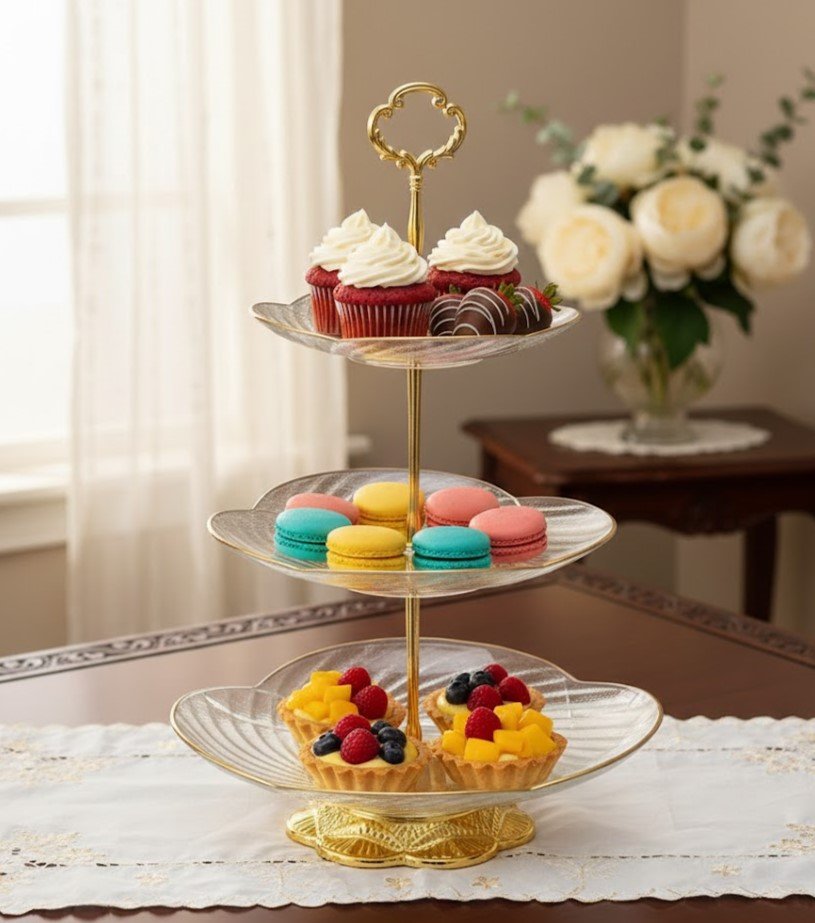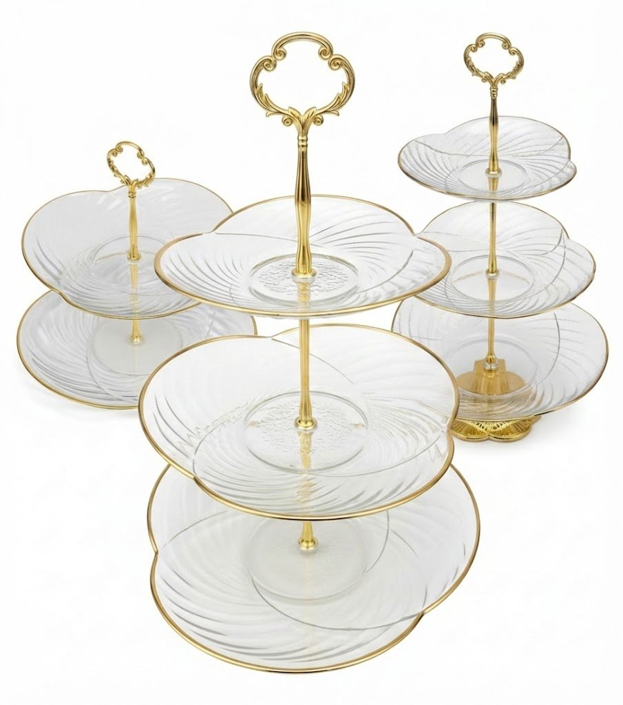 شيالة حلويات أكريليك شفافة بتصميم عصري فخم وحواف ذهبية أنيقة. متوفرة بعدة خيارات (2 دور، 3 دور، و3 دور بقاعدة ذهبية) لتناسب ضيافتك في جميع المناسبات والأعياد.