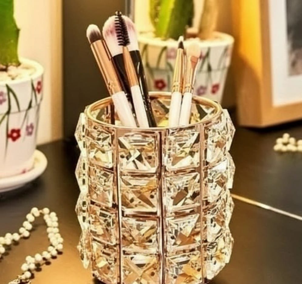 منظم فرش مكياج كريستال أنيق وفاخر. يجمع بين اللمسة الجمالية الكلاسيكية والعملية لتخزين الفرش وأقلام التجميل بشكل منظم ولامع. إضافة مثالية لطاولة الزينة الخاصة بك.