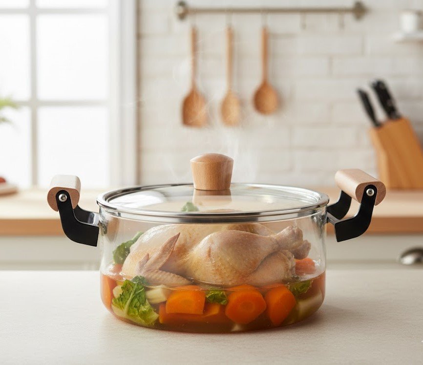 حلة بايركس حرارية أنيقة ، متوفرة بأحجام مختلفة (2.5، 3.5، 4.5، 5.5 لتر). مصنوعة من زجاج البايركس ، وتتحمل الصدمات الحرارية العالية، مما يجعلها مثالية للطهي المباشر وتقديم الطعام بأناقة. المقابض الخشبية توفر لمسة طبيعية ومريحة.