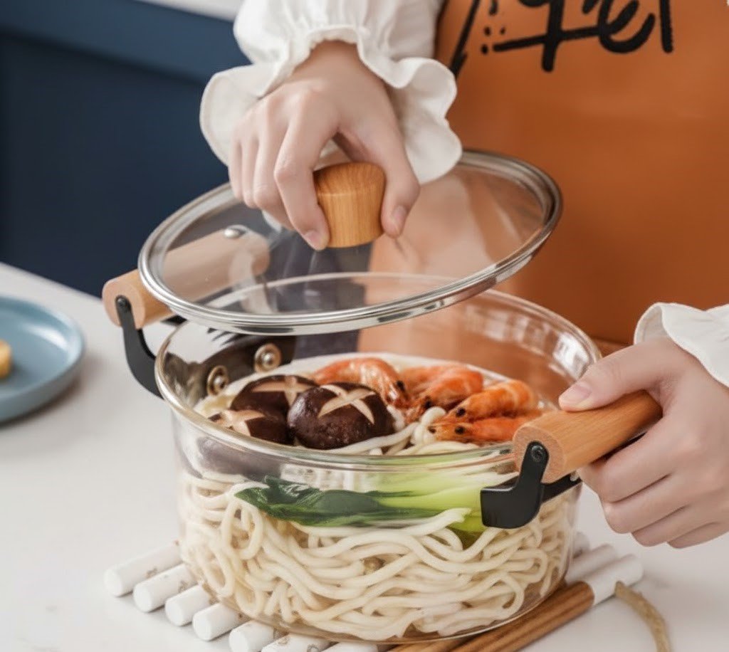 يمكن استخدامها للطهي مباشرة على الموقد (الغاز أو الكهرباء)، في الفرن، أو حتى للتخزين في الفريزر بأمان. المقابض المصنوعة من الخشب الطبيعي تضفي لمسة دافئة وتوفر قبضة مريحة وآمنة. التصميم الشفاف لا يبرز مهاراتك في الطهي فحسب، بل يتيح لك أيضاً مراقبة عملية نضج الطعام بسهولة. هذه الحلة عملية، صحية، ولا تمتص الروائح أو النكهات، مما يجعلها إضافة مثالية لمطبخك.