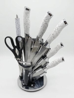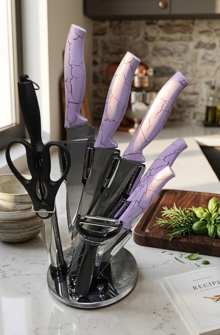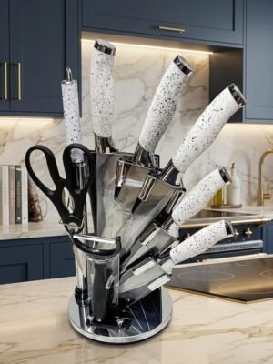 طقم سكاكين سيراميك فائق الحدة بتصميم رخامي راقٍ، يتكون من 9 قطع متكاملة تشمل سكاكين متنوعة، مقص، ومقشرة. يأتي مع حامل (رشاقة) عصري يوفر تنظيماً مثالياً ومظراً جذاباً لمطبخك .
