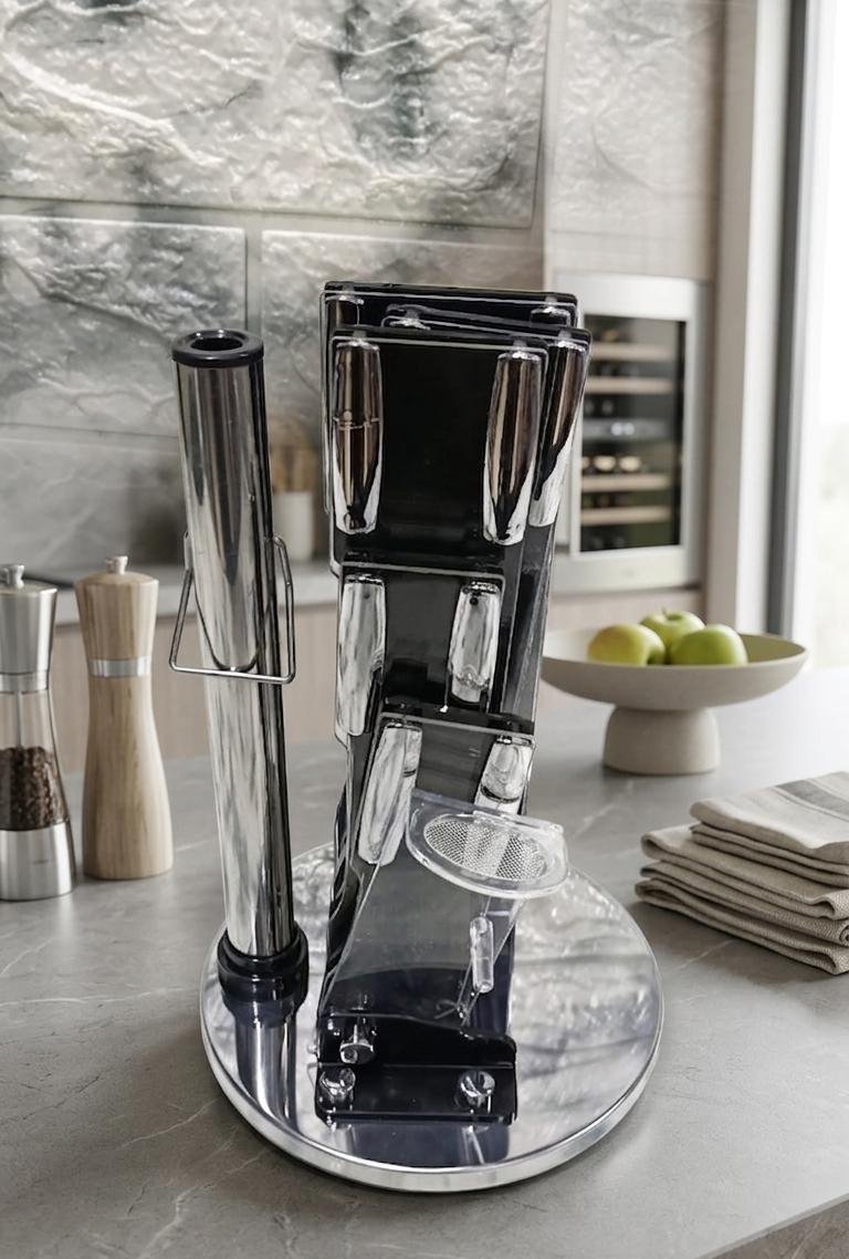 - رشاقة (حامل) أنيقة: قاعدة دائرية متينة مع حامل شفاف يحافظ على السكاكين منظمة ومحمية، ويجعل الوصول إليها سهلاً وسريعاً .