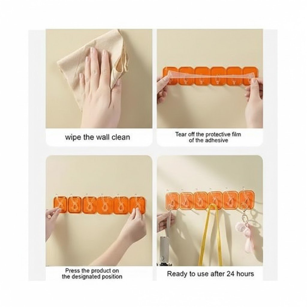 - تركيب خالٍ من المتاعب: لا حاجة للثقب أو استخدام الأدوات. ببساطة قم بإزالة الطبقة الواقية واضغط الشماعة بقوة على سطح أملس ونظيف (مثل البلاط، الزجاج، المعدن، أو الخشب المصقول).