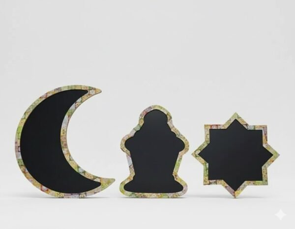 هذا الطقم هو إضافة فريدة ومتعددة الاستخدامات لديكور منزلك خلال شهر رمضان المبارك. يتكون من ثلاث قطع ديكورية مغطاة بطلاء أسود غير لامع في المنتصف، الحواف مزينة بنقوش ورقية أو بلاستيكية ملونة بزخارف إسلامية تقليدية. يمكن استخدامها كأطباق تقديم للتسالي والمكسرات، أو كديكورات جدارية أو طاولة لعرض العبارات الاحتفالية. يجمع هذا الطقم بين الطابع العملي والشكل الجمالي ليخلق جواً مميزاً ومرحباً في منزلك.