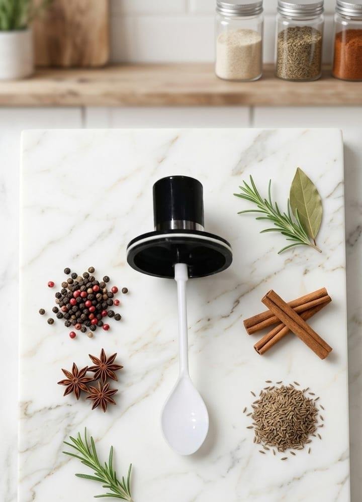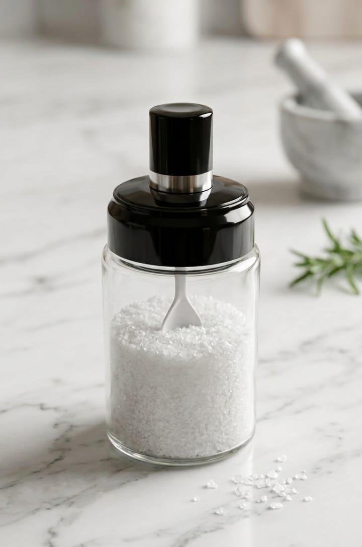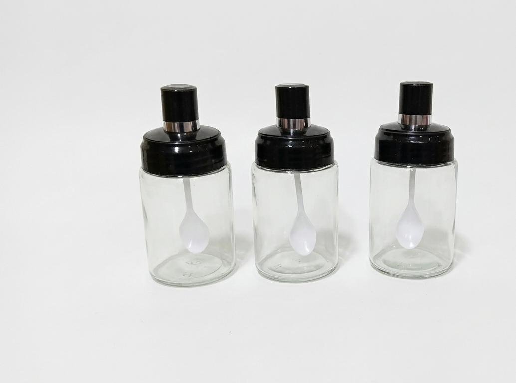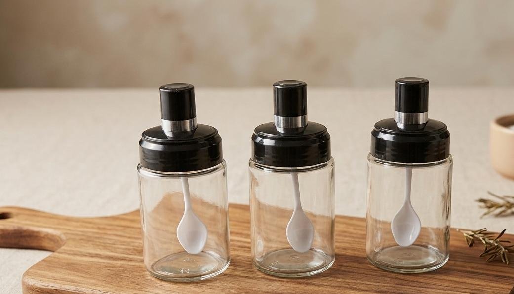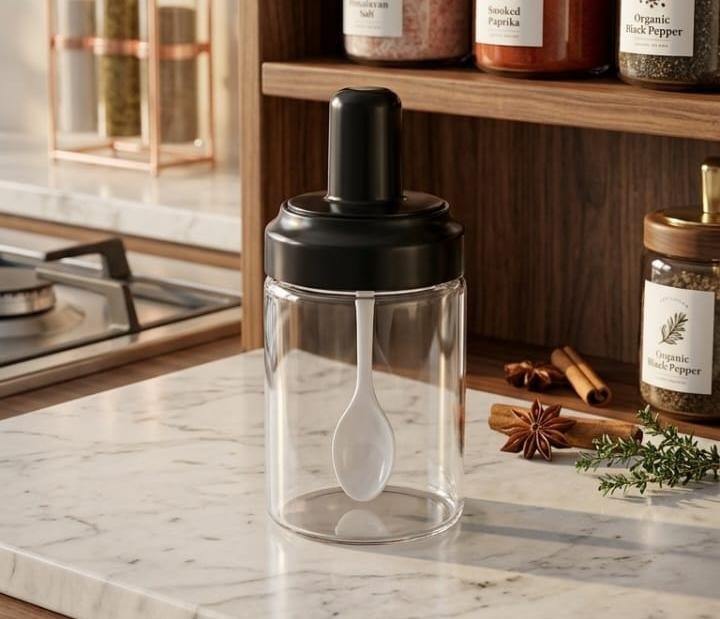 - طقم توابل زجاجي أنيق مكون من 3 قطع مع أغطية سوداء وملاعق مدمجة لتسهيل الاستخدام. تصميم عصري وشفاف يحافظ على نكهة بهاراتك ويجعلها في متناول يدك دائماً.