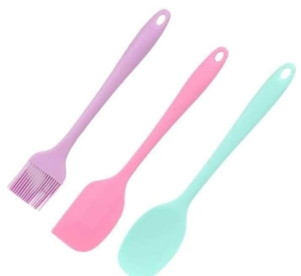 طقم توزيع من السيليكون الحراري يضم معلقة، اسباتولا، وفرشاة. مثالي لجميع احتياجات الطبخ والخبز، فهو آمن للاستخدام مع الأواني غير اللاصقة مثل الجرانيت والتيفال لحمايتها من الخدوش.