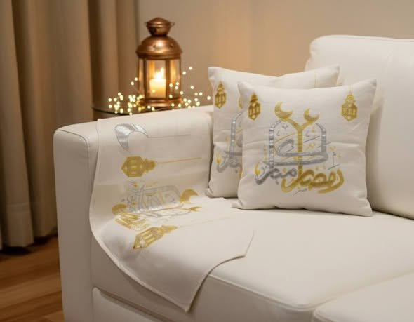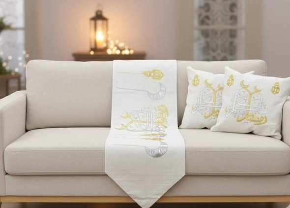 هذا الطقم هو إضافة مثالية لتزيين منزلك بلمسة من الرقي خلال شهر رمضان المبارك. يتضمن رانر طويل وغطاءين متطابقين للوسائد، مصنوعة من خامات عالية و عالي الجودة. التصميم يتميز بنقوش إسلامية دقيقة وخط عربي أنيق (مثل “رمضان كريم”)، مطرزة يدوياً أو آلياً بخيوط السيرما المعدنية الذهبية والفضية، مما يمنحها لمعاناً جذاباً ومظهراً باهظ الثمن. يجمع الطقم بين الطابع التقليدي والحرفية العالية ليخلق جواً احتفالياً ومميزاً ومرحباً للعائلة والضيوف.