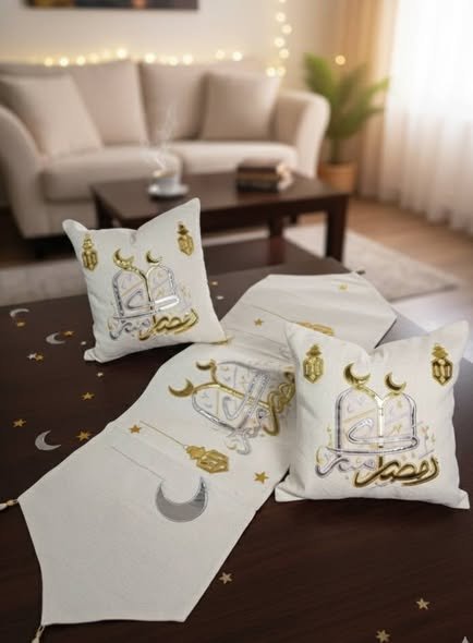 طقم ديكور رمضاني فاخر يتكون من رانر وغطاءين للوسائد، مصنوع من خامات عالية ومزين بتطريز سيرما (خيوط معدنية) ذهبية وفضية لامعة. يضفي هذا الطقم لمسة من الفخامة والروحانية على أي غرفة.