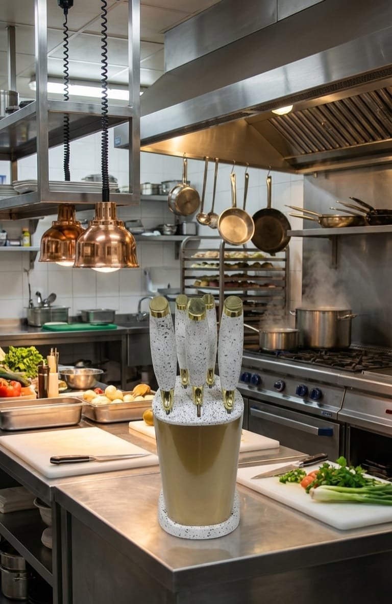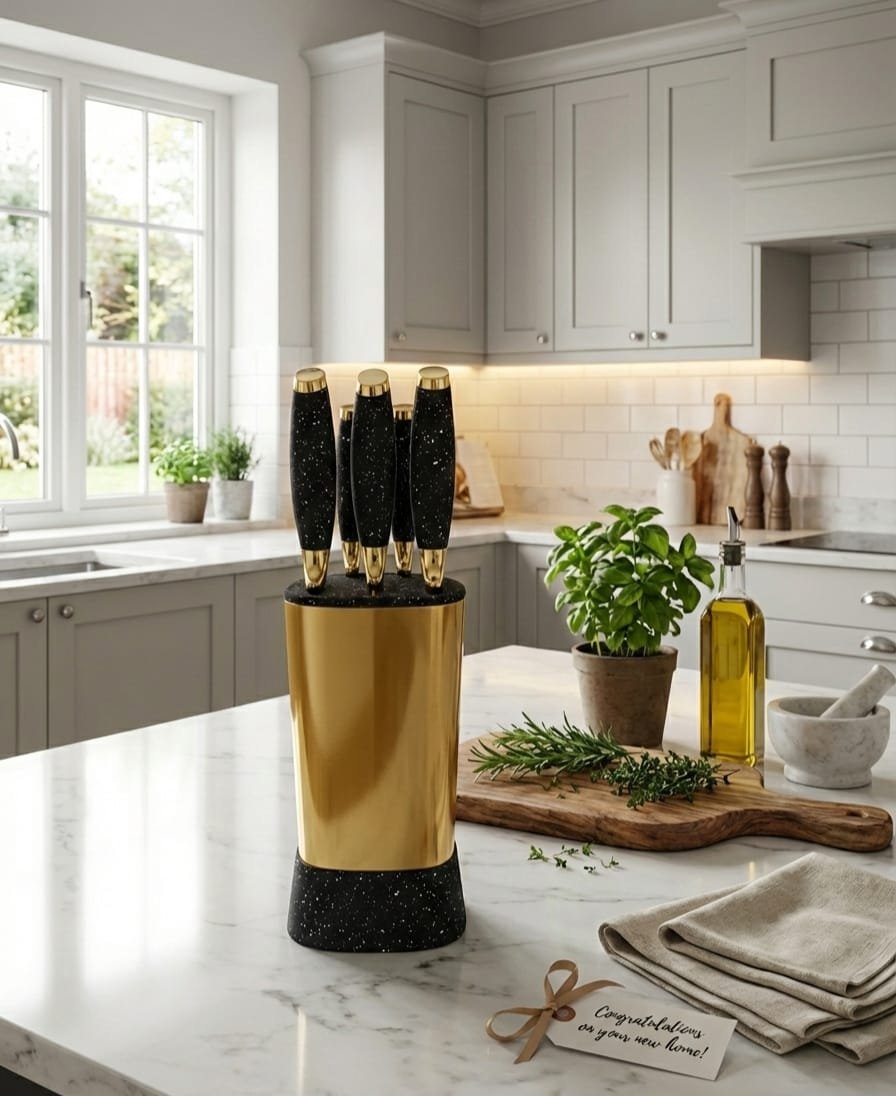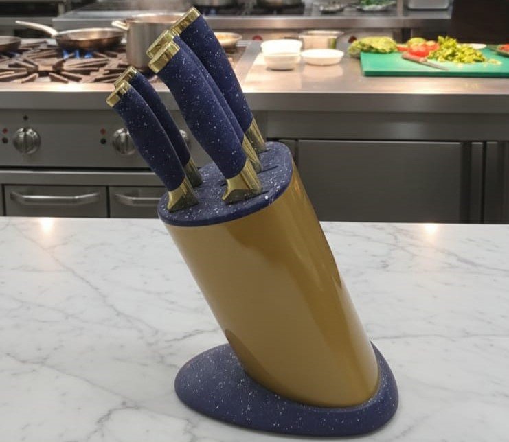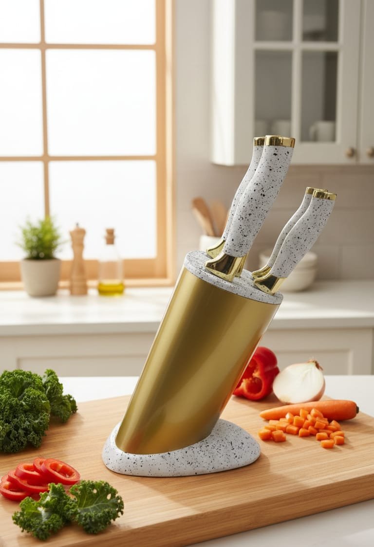 - حل تخزين أنيق: الستاند الذهبي لا يحمي الشفرات فحسب، بل يضيف أيضاً لمسة عصرية وراقية لديكور مطبخك.