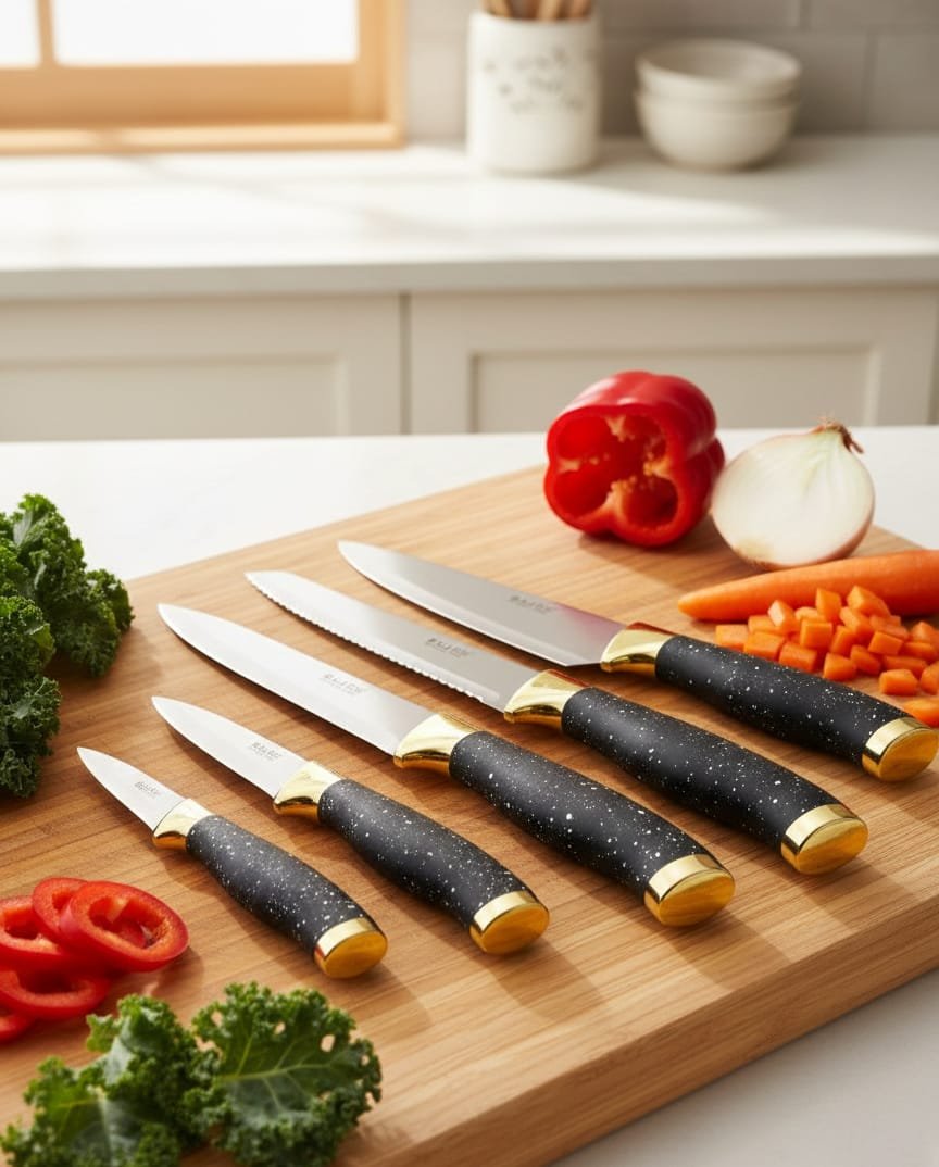 - تشكيلة شاملة: يتضمن الطقم 5 سكاكين أساسية: سكين الطاهي، سكين الخبز، سكين التقطيع، سكين الفائدة، وسكين التقشير (قد تختلف الأنواع قليلاً حسب الموديل).