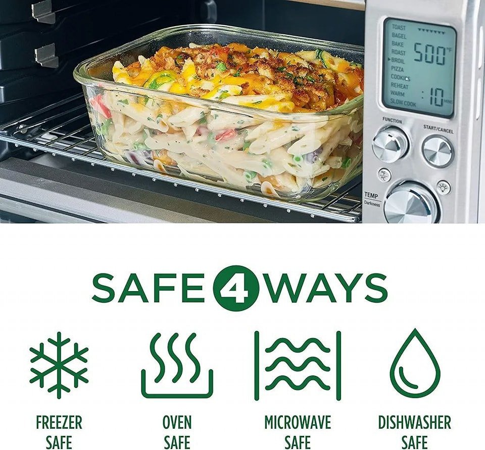 - زجاج بايركس متين: يتحمل درجات الحرارة العالية في الفرن والمنخفضة في الفريزر (بدون الغطاء).